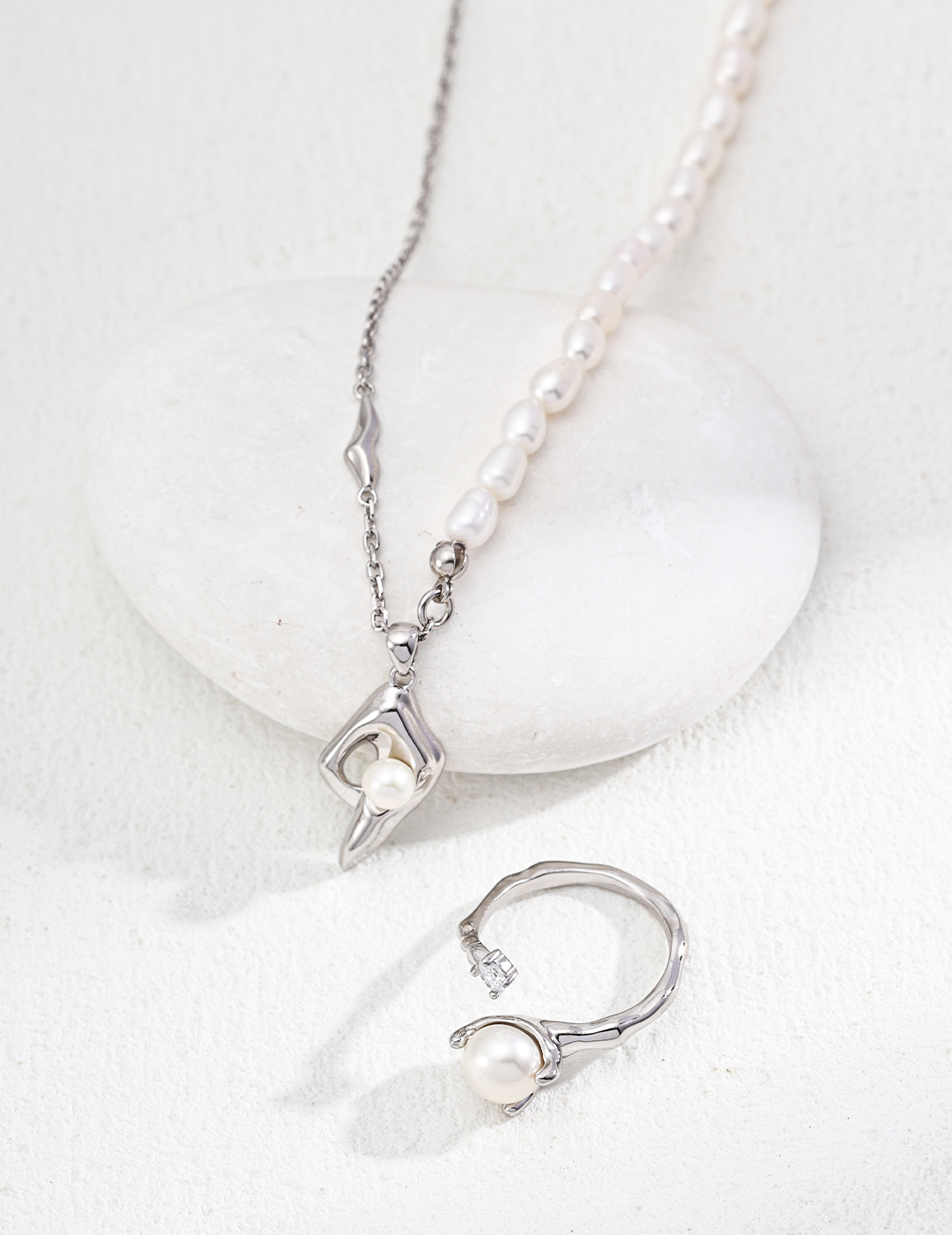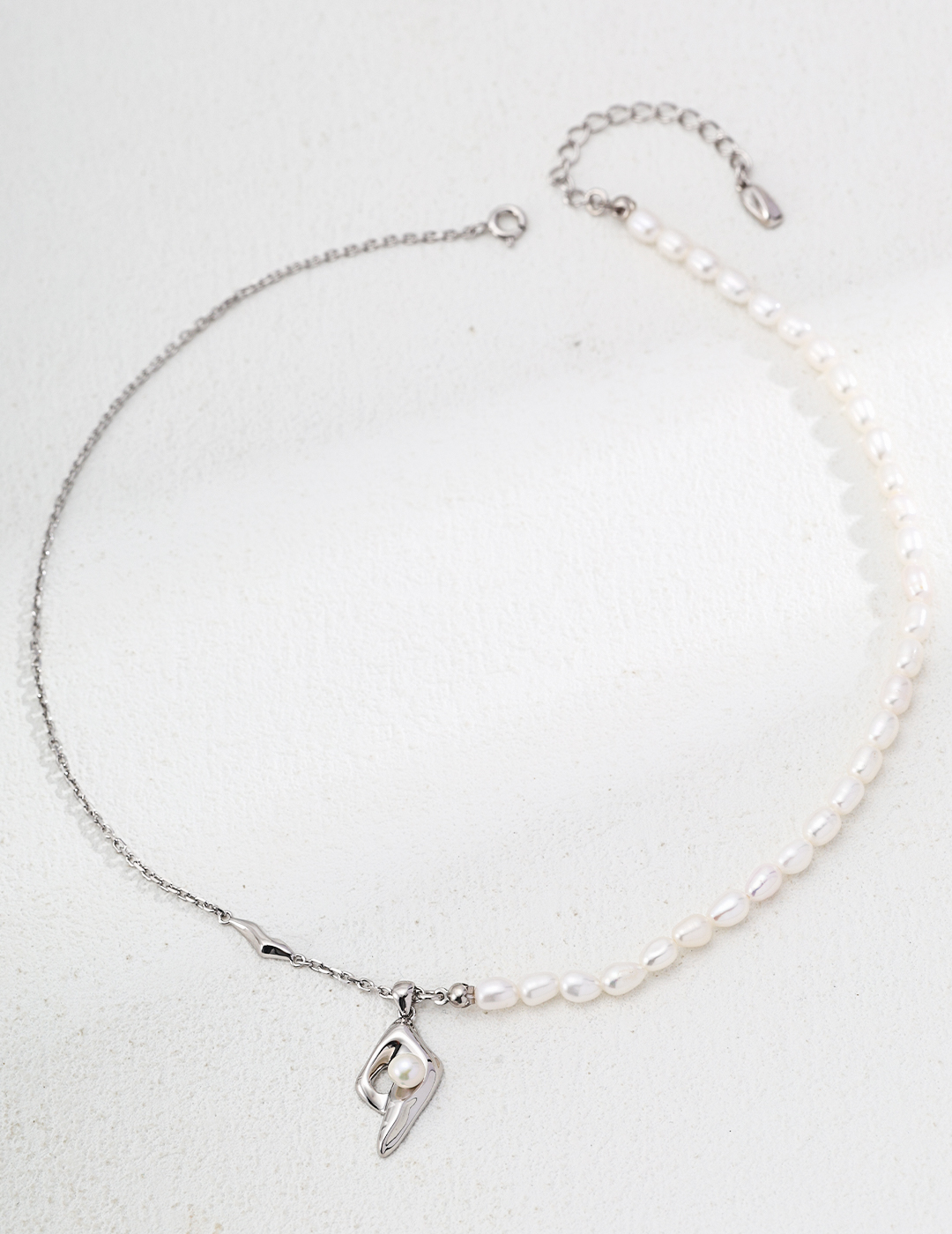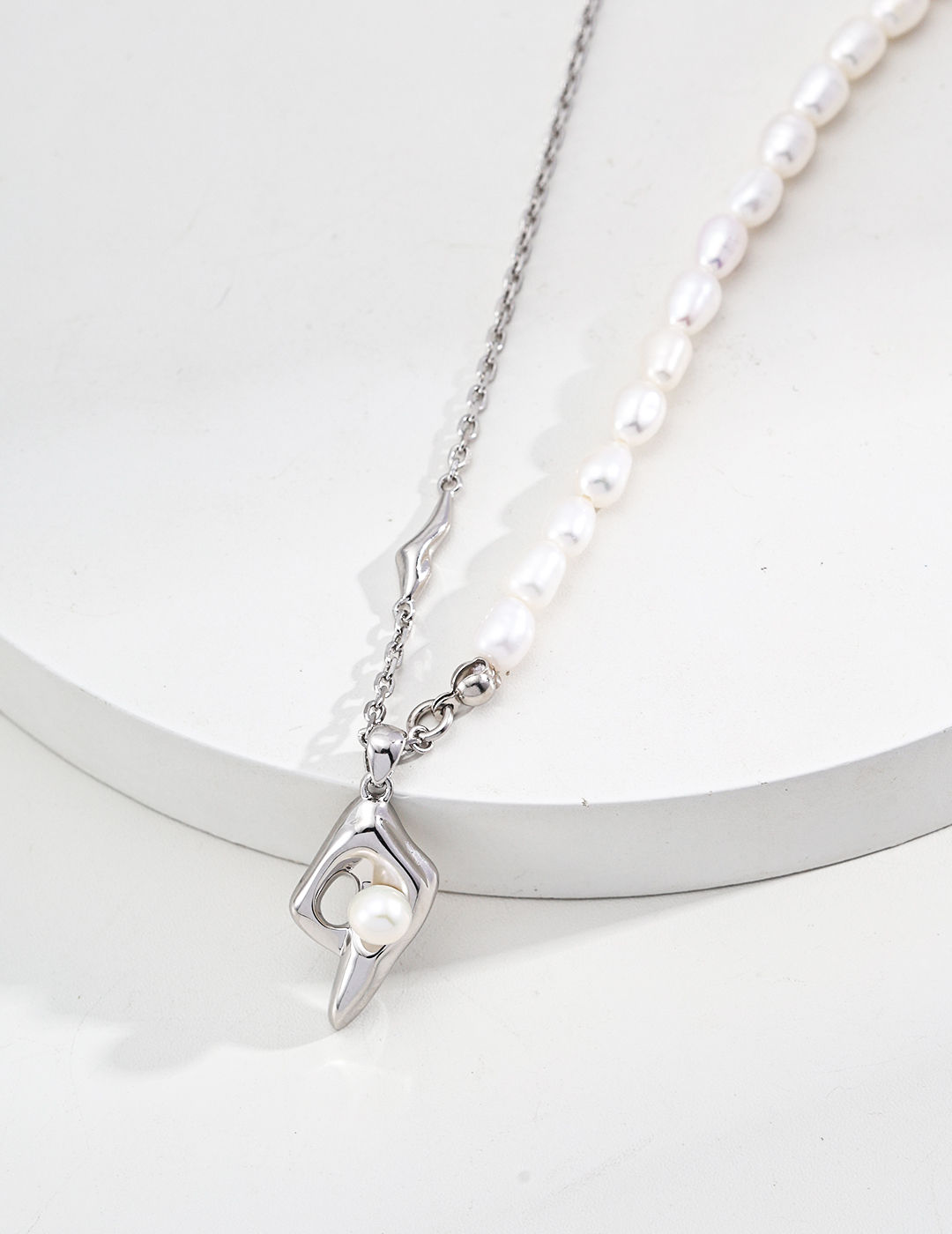 This exquisite sterling silver pearl necklace combines elegance with a modern twist. The pendant?s irregular geometric shape and the unique mix of pearl and silver links make it a standout piece for any jewelry collection. Perfect for elevating everyday wear or adding a touch of sophistication to evening attire, this necklace blends classic and contemporary styles seamlessly.