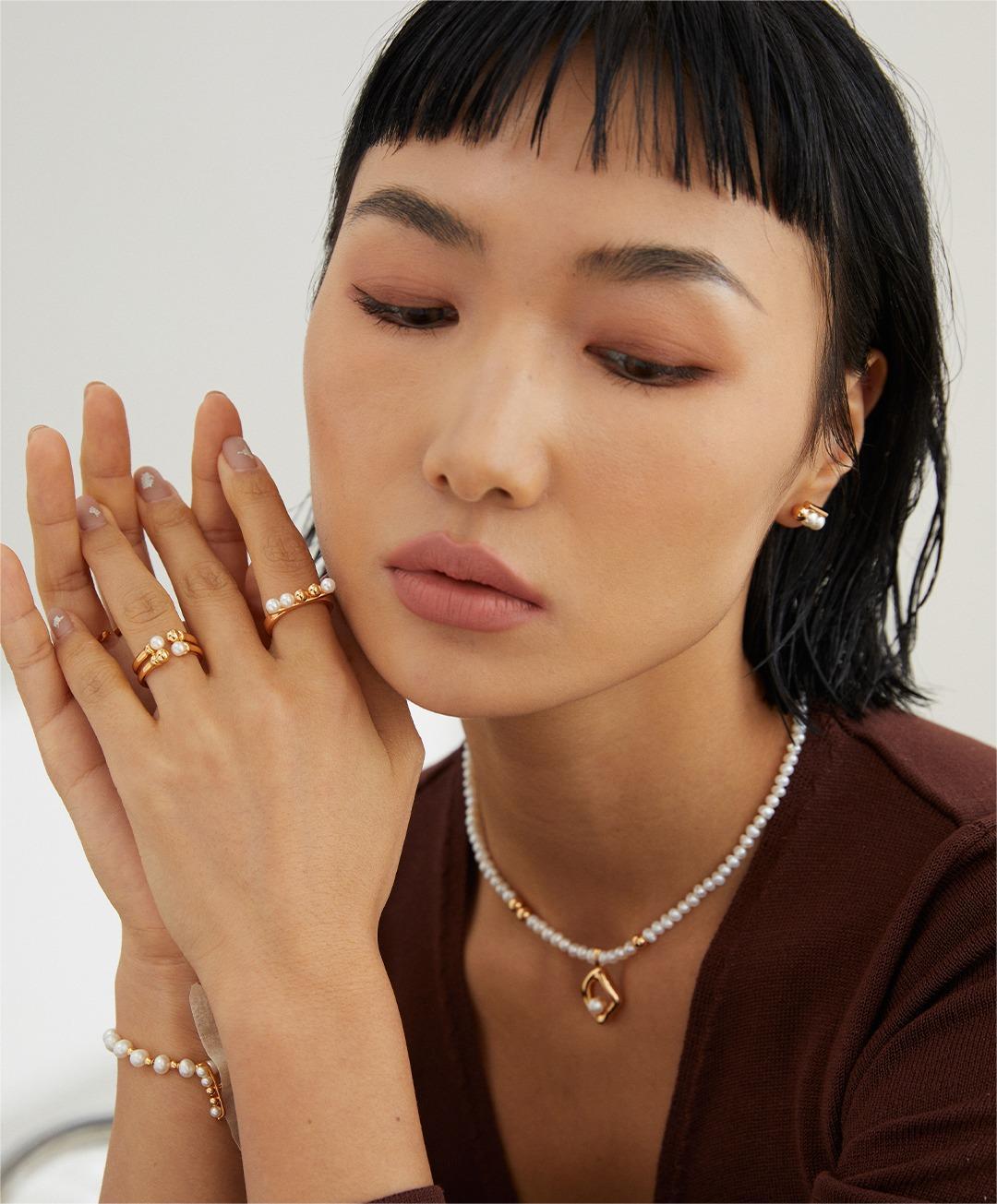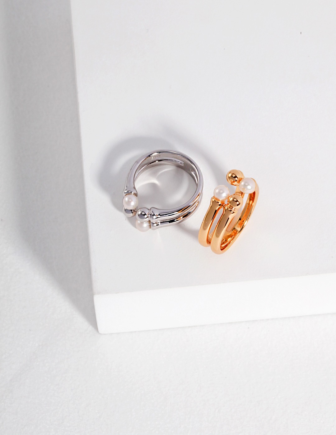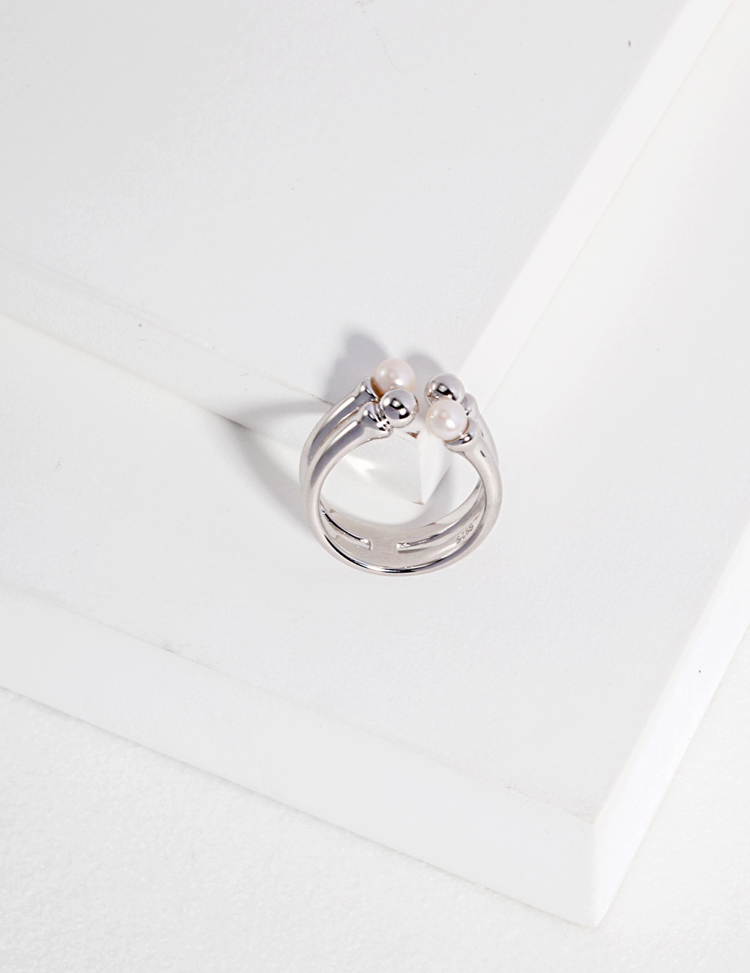 This double-layer sterling silver pearl ring features an open-ended design with an intersecting structure and asymmetrically spaced pearls, delivering a chic, modern aesthetic. Inspired by trending minimalist styles, it pairs seamlessly with casual or elegant looks.