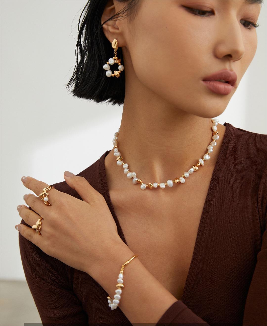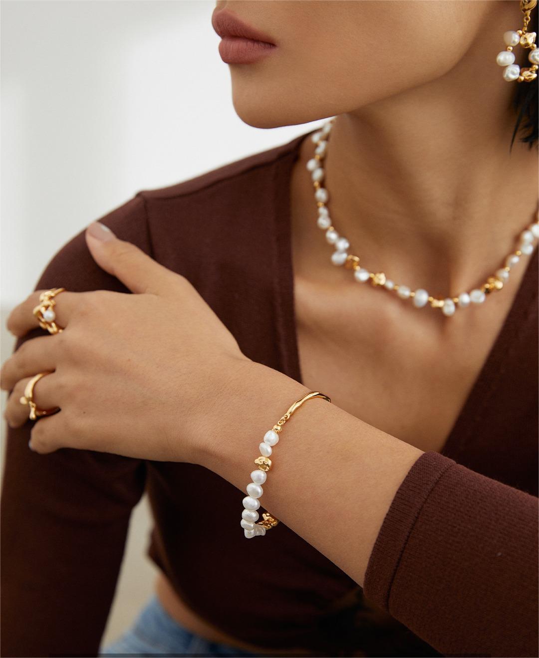 Embrace elegance with our sterling silver pearl bracelet, featuring a natural fluid design. The bracelet’s silver metal mimics the flow of liquid, creating a unique clasp, complemented by stone-shaped pearls and silver beads. This design beautifully captures the essence of natural streams.