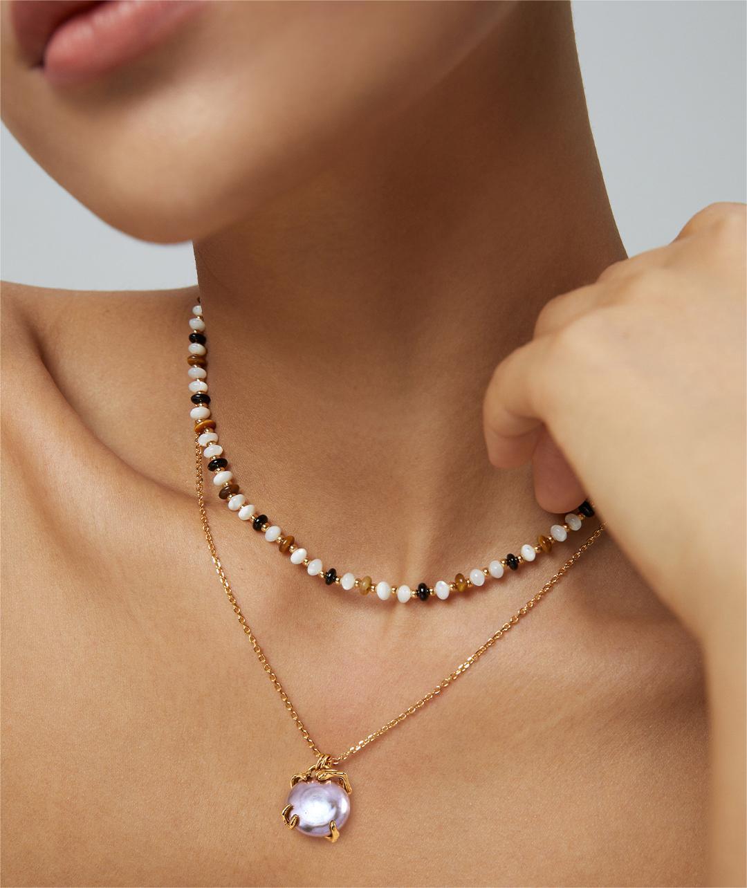 Featuring a luminous coin pearl hugged by abstract claw-shaped gold prongs, this Iridescent Coin Pearl Necklace blends modern edge with classic elegance. The soft, natural glow of the pearl is perfectly balanced by the fluid metalwork, making it a versatile staple for both day and night. Wear it solo for subtle impact or layer it with other necklaces to create your signature look.