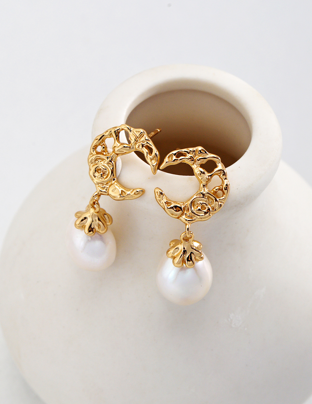 The Lace Moon pearl Earrings elegantly combine the timeless appeal of vintage gold with the classic beauty of pearls. Crafted from high-quality sterling silver and plated in a rich vintage gold finish, these earrings exude a unique, antique charm. The design is inspired by the delicate contour of the moon, with intricate lace-like cutouts adding a light, layered effect. The pearl featured in each earring imparts a touch of refined luster, elevating the overall aesthetic.