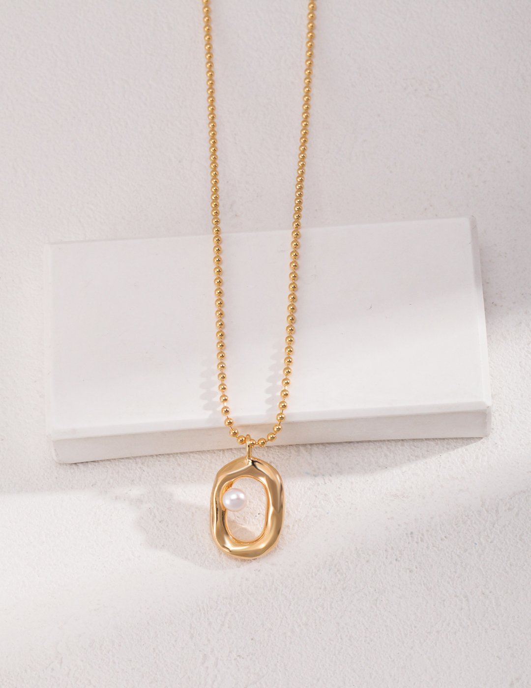 A modern oval frame embracing a single freshwater pearl โ€” timeless elegance with a sculptural twist.
