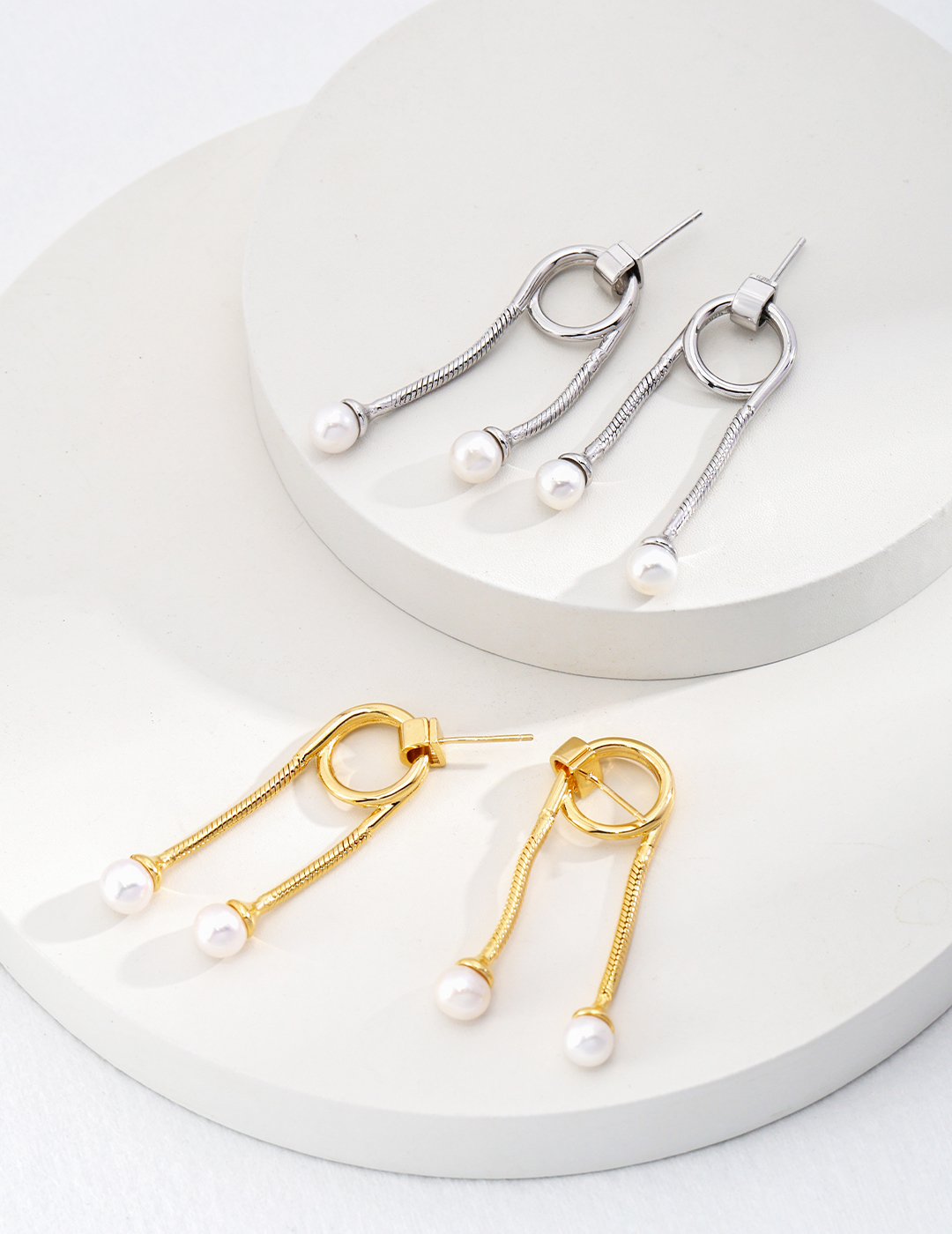 Elevate your style with our Minimalist Rope Design Sterling Silver Pearl Earrings, inspired by the elegance of nature. Featuring two luminous pearls resembling morning dewdrops, paired with golden lines that mimic rays of sunlight, these earrings exude refined sophistication. Perfectly crafted from sterling silver and pearls, they are available in vintage gold and platinum silver finishes, combining simplicity with timeless grace.