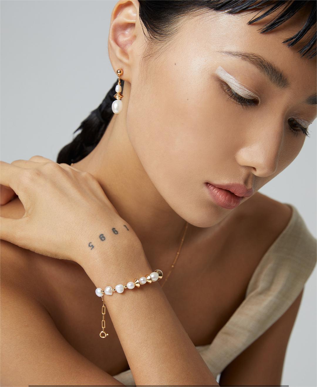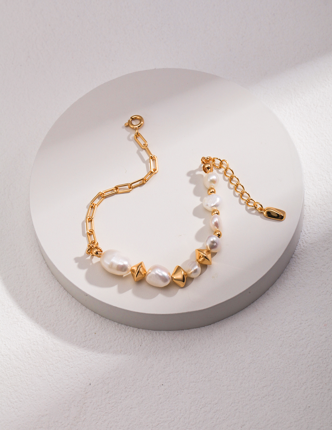 This bracelet features a series of natural potato Baroque pearls in a gradient of sizes, interspersed with three-dimensional disc-shaped spacers. The combination adds a touch of sophistication and design flair to the otherwise understated piece.
