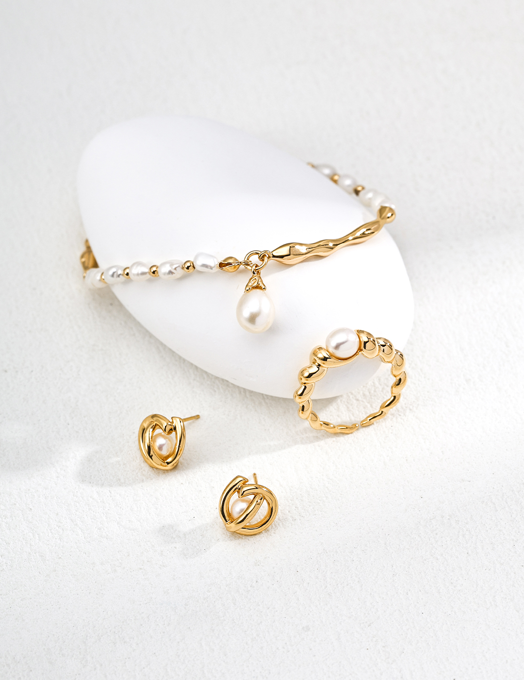The Orbit Pearl Studs feature a smooth, interlocking loop design that gently frames a freshwater pearl at the center — creating the look of a pearl suspended in motion. The polished metal curves give a refined yet contemporary feel, making these earrings perfect for both everyday styling and elegant occasions.