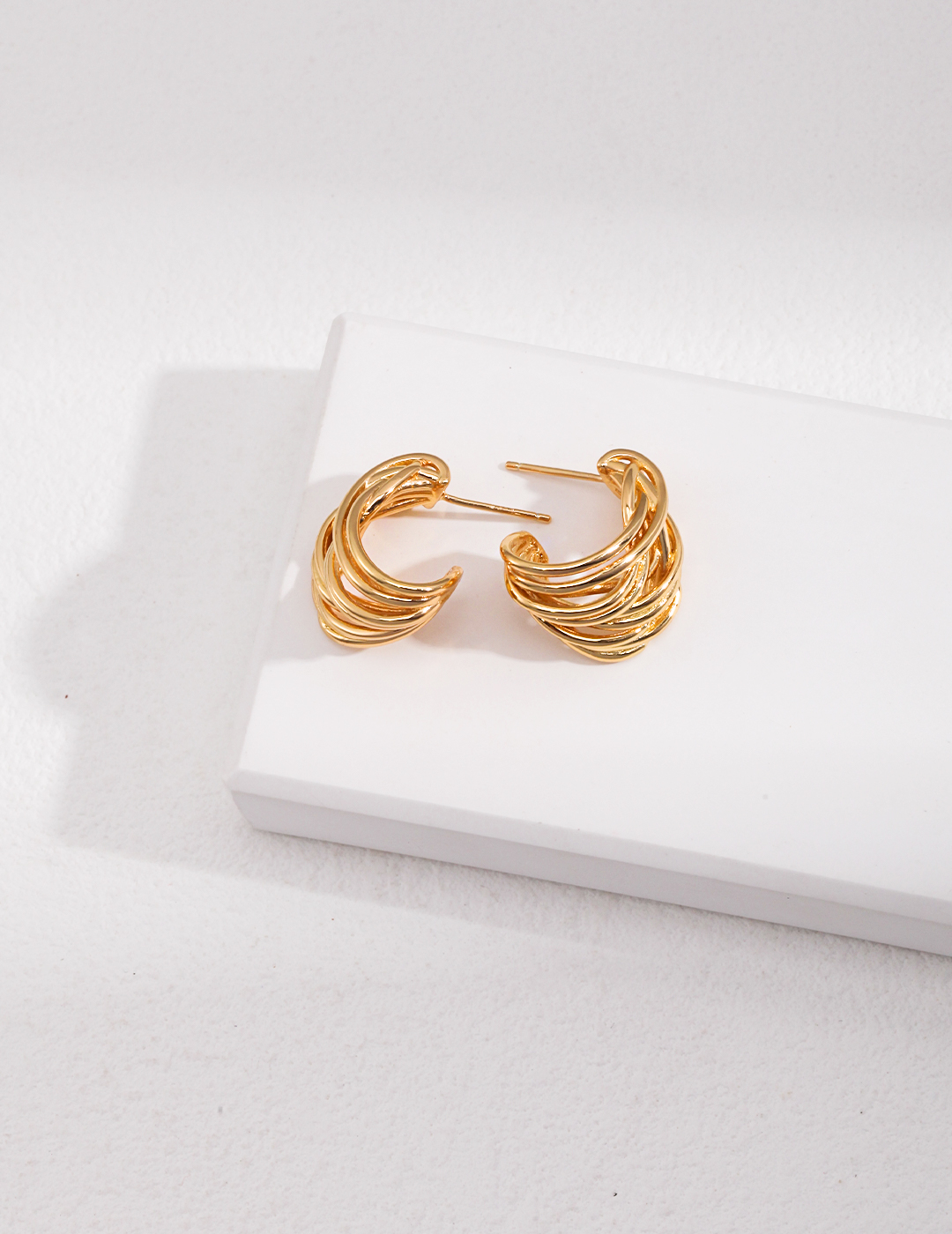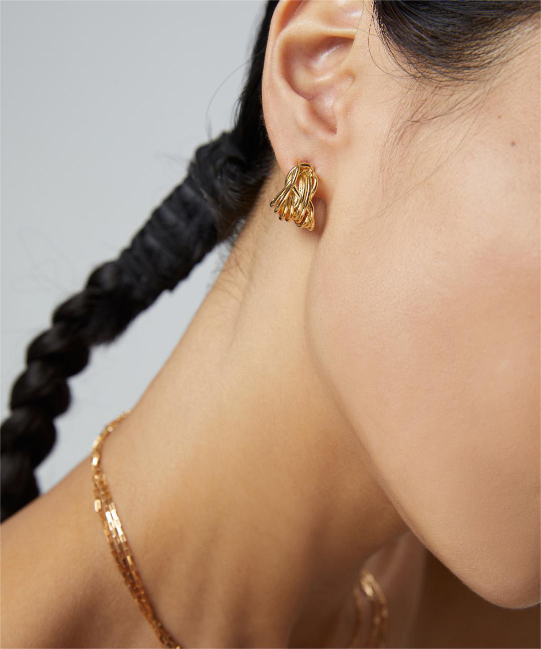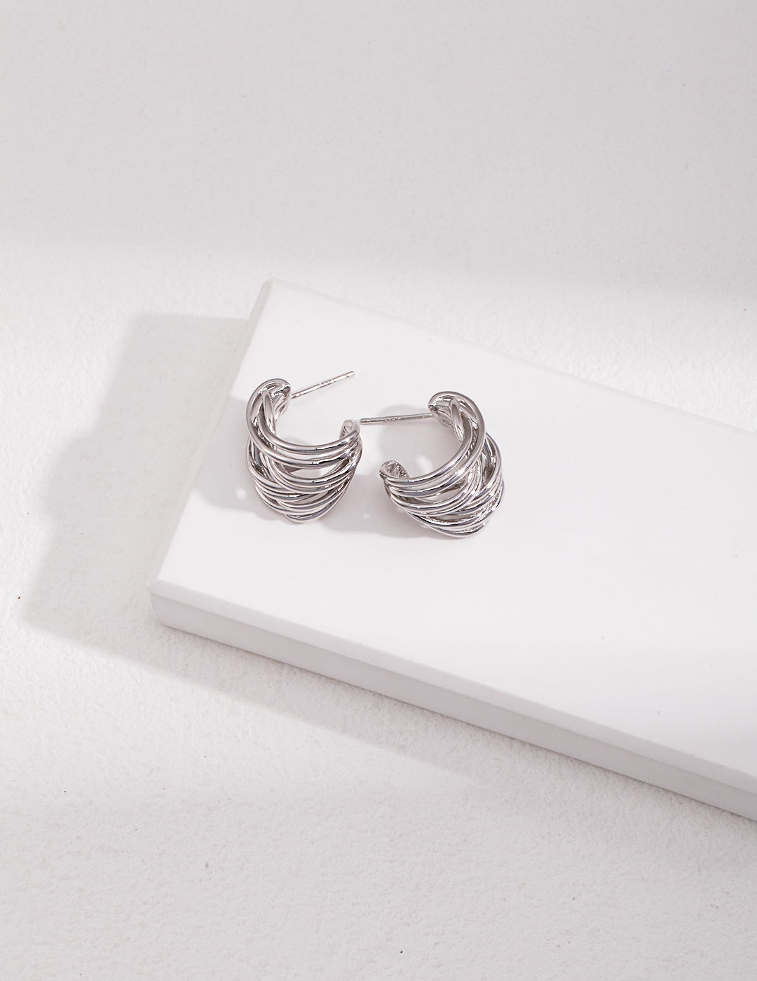 These Sterling Silver Linework Earrings feature a unique design resembling unraveled threads. The interwoven, layered lines create a sense of depth and texture, showcasing sophisticated craftsmanship and modern aesthetics.