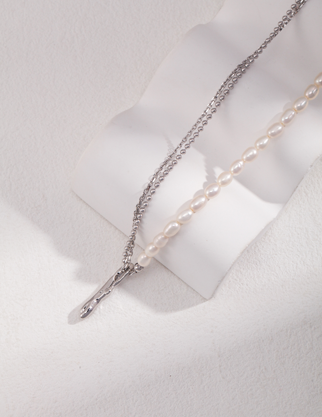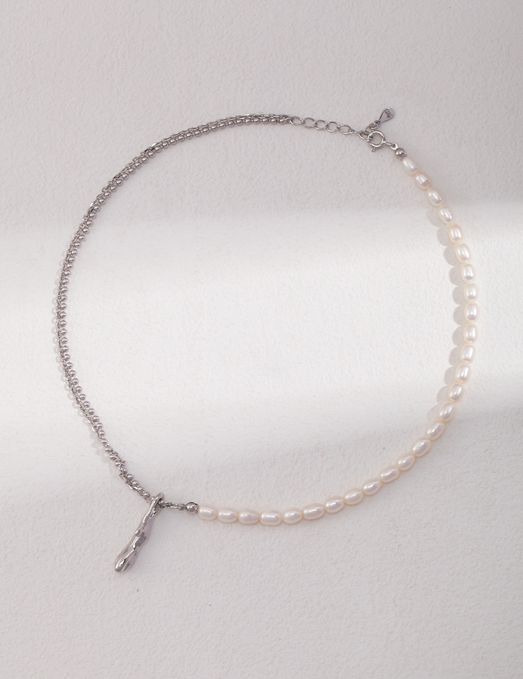 Embrace the beauty of natural flow with this sterling silver rice pearl necklace. Featuring natural rice pearls paired with a sleek silver chain, the design mimics the fluidity of liquid drops, creating a stunning, dynamic pendant. Perfect for adding a touch of modern elegance to any outfit, this necklace celebrates natural form and timeless charm.