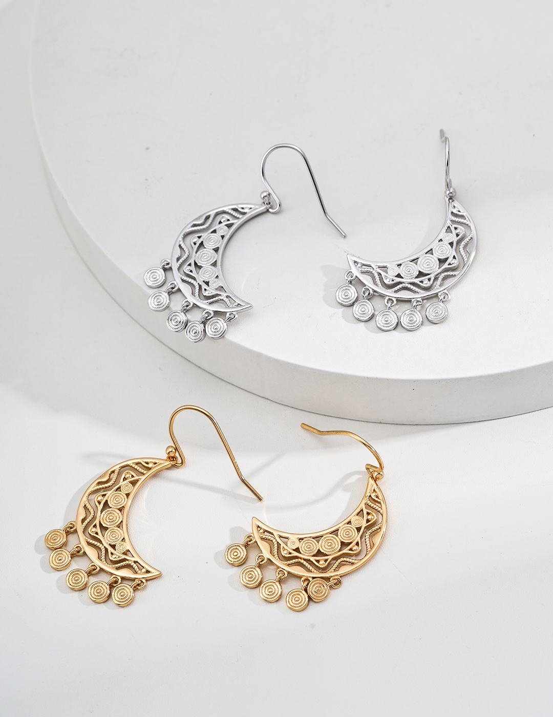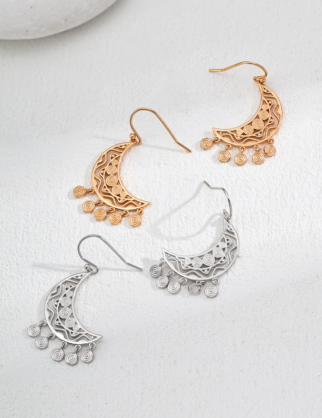 Discover the enchanting charm of our Sterling Silver Vintage Crescent Moon Earrings. These stunning gold-tone earrings beautifully blend modern fashion with traditional craftsmanship. Featuring intricate patterns that tell ancient stories, each detail is steeped in rich cultural significance.